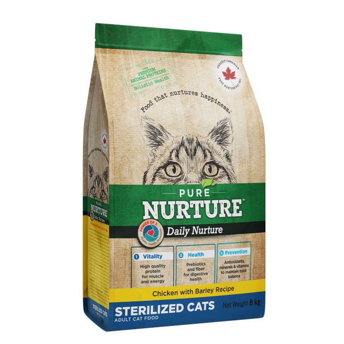 Hrana uscată completă Pure Nurture cu pui și orz pentru pisici sterilizate este o nutriție holistică special formulată pentru a susține greutatea optimă, sănătatea urinară și nivelul de activitate după sterilizare. Formula Daily Nurture combină proteine animale de înaltă calitate, cereale integrale și complexul caracteristic Power of 3 , oferind o nutriție zilnică echilibrată.
