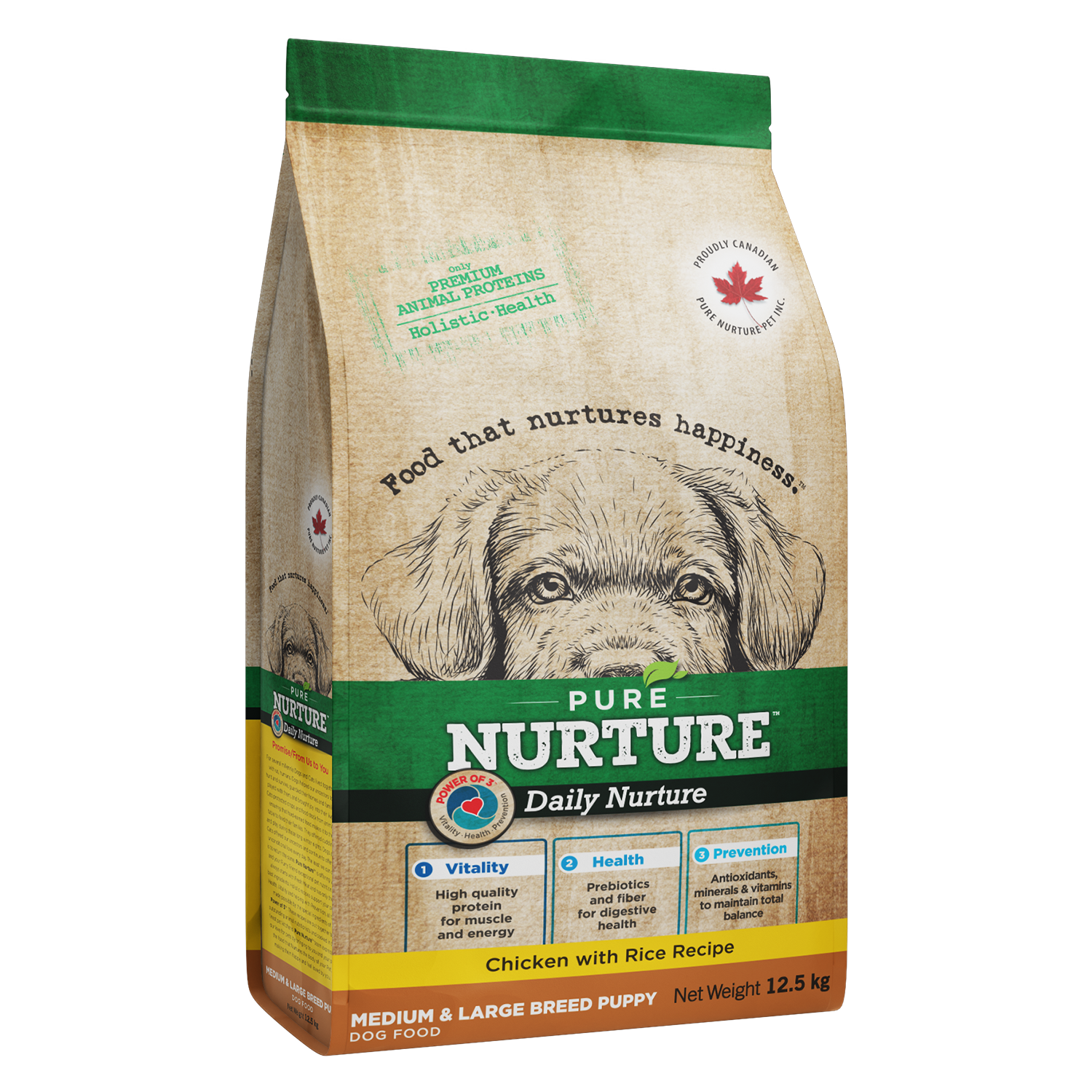 Hrana uscată completă Pure Nurture Daily Chicken with Rice Recipe Medium & Large Breed Puppy este destinată cățeilor de rasă medie și mare. Formula Daily Nurture cu cereale de înaltă calitate susține creșterea sănătoasă, dezvoltarea musculară și formarea corectă a scheletului. Dieta este creată conform principiului holistic al nutriției și conține ingrediente proaspete și complexul brevetat Power of 3 – o combinație de proteine, prebiotice și oligoelemente pentru dezvoltarea completă a cățelului.